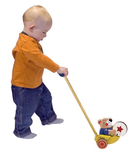 Playful bear twists from side to side and beats the drum when pushed forward! Our fabulous wooden push and pull bear toy is classically-styled, yet uniquely-designed with entertaining motions and sounds to help advance gross motor skills and cognitive development with every step! All feature non-skid wheels. Ages 1 year+ 11" x 22" x 5" boxed